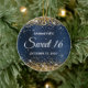 Crie seu próprio ornamento do círculo Sweet 16 para sua filha. Você pode personalizar o texto da caligrafia "Sweet 16" ou o estilo da fonte. O fundo da arte digital apresenta um brilho dourado falso e marinho escuro e papel azul empoeirado. Na parte de trás, você pode adicionar uma foto de família se quiser. Enfeite de 16 anos para ela.