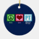 O ornamento da Terapia Física Peace Love em azul. Um belo presente fisioterapeuta. Amor pela paz e fisioterapia em fundo azul escuro.