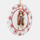 Na frente deste ornamento de Feriado está uma bela imagem aquática de um cão de Caça Basset vestindo um chapéu de Santa listrado vermelho e branco. A imagem é colocada em um círculo branco formado por um padrão retrô vermelho de floco de neve. A parte traseira do ornamento tem o mesmo plano de fundo e círculo com o texto personalizado em branco em um plano de fundo vermelho correspondente. Bonita, especialmente para alguém que ama um Caçador Basset.