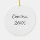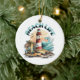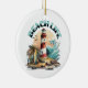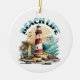 Enfeites de natal temático da praia. Ilustração de uma cena de praia com farol, pranchas, palmeiras e golfinhos.