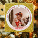 Trendy, elegante e fofo personalizou o Primeiro Ornament de Bebê de Natal para excelentes-avós com um quadro branco com flocos de neve e estrelas num fundo brilhante (faux) de ouro. A frente tem uma abertura redonda para uma personalizada nova menina e foto de avós e uma banda rosa curvada na qual aparece o nome do recém-nascido em uma fonte/tipografia moderna, e o outro texto personalizado, "Nosso Primeiro Natal como Excelente-Avós" A parte de trás tem uma foto de bebê com o texto personalizável "Primeiro Natal 202Y" na banda rosa.