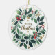 Uma ilustração perfeitamente detalhada da coroa das festas, composta por várias folhas e ramos verdes, enfeitados com bagas vermelhas brilhantes. A coroa apresenta folhagem embaçada, sagrada, e verde-esverdeada com sotaques de iluminação sutis, dando-lhe uma sensação festiva e elegante. O design é delicado, mas vibrante, perfeito para decorações de Natal ou trabalho de arte sazonal. Mude a foto e o nome para o seu querido bebê e tenha um presente de ornamento de árvore da família festiva!