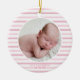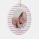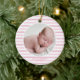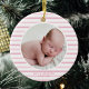 Este belo Enfeites de natal comemorativo de menina apresenta uma fotografia bonito de seu filho, recém-nascido, entre listras rosa pálidas. Um novo presente de Natal de bebê chique para uma nova mãe ou para um conjunto orgulhoso de avós. Personalize com o nome do seu filho e a data de nascimento para que a foto seja apreciada para sempre.