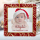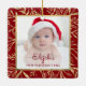 Celebrar o primeiro Natal do bebê com este lindo ornamento de keepape. Substitua facilmente a imagem de exemplo por sua própria foto favorita e personalize-a com o nome do bebê na letra burgundy red script e no ano abaixo. Uma tela de gradiente branco ajuda a fazer o pop de texto. A foto é tirada por um elegante quadro quadrado decorado com folhagem de folha de papel dourada desenhada à mão sobre um fundo vermelho arrojado.