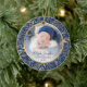 Celebrar o primeiro Natal do bebê com este lindo ornamento de keepape. Substitua facilmente a imagem de exemplo por sua própria foto favorita e personalize-a com o nome do bebê na fonte do script azul marinho e no ano abaixo. Uma tela de gradiente branco ajuda a fazer o pop de texto. A foto é disparada por uma elegante armação redonda decorada com folhagem dourada desenhada à mão sobre fundo azul marinho.
