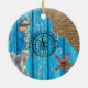 Uma textura de fundo rústica de madeira azul, burlap faux, starfish laranja, concha, coral branco e bússola centrada em texto personalizado. Um design náutico com um toque moderno. Personalize o texto e torne-o seu.