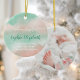 Estatísticas de natalidade personalizadas e nome elegante de roteiro com adorável ornamento de fotos de bebês em doce mistura de nuvens cor-de-rosa e turquesa verde pastel, ideal para criar atmosfera quente e acolhedora para o primeiro Natal de um recém-nascido. Este capricho caprichoso é uma maneira moderna e elegante de dizer "Bem-vinda menina" neste feriado.