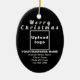 Feliz Natal! Encaminhamento cerâmico com textos de saudação de Feliz Natal, nome de sua empresa ou empresa, logotipo, endereço e número de telefone. Designs são textos brancos sobre fundo preto e forma oval. Ornamento para decorar a árvore de Natal em sua loja, compro ou escritório. Ornamento para receber visualmente seus clientes nesta temporada de feriados e anunciar sua empresa ou promover seu nome de marca. Personalize-o e use-o para criar reconhecimento de nome de marca. Verifique a aparência após carregar o logotipo e digitar textos. Se a aparência lhe agrada, você pode colocar seu pedido agora. Se você precisar redimensionar e mover o logotipo e os textos para o ajustado neste ornamento ou em outros estilos que você escolher, mude na ferramenta design. Você também pode fazer outras alterações de acordo com sua preferência na ferramenta design, como alterar a cor do ornamento, a cor da fonte e o estilo da fonte. Feliz Natal! Desejo mais vendas para você neste feriado.