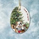 Na frente deste ornamento de Férias está a imagem de um adorável cachorrinho de Bulldog deitado em sua cama de vime em frente a uma árvore de Natal decorada. O texto vermelho curvo no lado diz "NATAL". No verso, o texto vermelho e verde diz MERRY CHRISTMAS", e há campos de texto adicionais para você personalizar o que quiser.