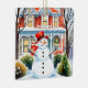 Enfeites de natal personalizado. Uma bela ilustração aquosa de um boneco de neve em frente a uma casa vitoriana suburbana em um doce bairro acolhedor.