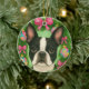 Celebrate the holidays with timeless charm and dog-lover warmth with this festive Boston Terrier Christmas ornament. Featuring a beautifully illustrated Boston Terrier framed by a lush evergreen wreath adorned with pastel ornaments and soft pink bows, this design brings classic holiday elegance to any Christmas tree.
