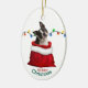 Na frente deste ornamento de Natal é uma imagem de um adorável cachorro preto e branco de Boston Terrier em uma bolsa de presente de Natal vermelha e branca. Atrás do cachorro há uma série de luzes coloridas de Feriado. O texto no final diz "Feliz Natal". A parte traseira do ornamento tem a mesma imagem com um campo de nome personalizado.
