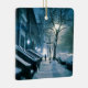 Uma pessoa que anda abaixo de uma rua coberto de neve no lado oeste superior da Nova Iorque em uma noite do inverno