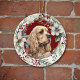 Na frente deste ornamento de Feriado está a imagem de um lindo Cachorro Americano Cocker Spaniel. O retrato está sobre fundo vermelho de Natal, e enquadrado dentro de um galho rústico, morango vermelho, coroa floral branca e coroa verde. No verso, o texto vermelho e verde diz MERRY CHRISTMAS e "FELIZ ANO NOVO". O texto está em campos de texto personalizáveis, então você pode fazê-lo dizer o que quiser.