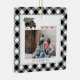 Ilustração de um bisão de búfalo vestindo chapéu de Papai Noel com árvore de Natal amarrada às costas. Design de borda de xadrez de búfalos preto e branco com texto preto e vermelho. Bota de cowboy no canto inferior direito.