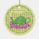 O bule verde nestled no primavera cor-de-rosa bonito floresce em um verde original, cor-de-rosa e o fundo de creme da xadrez é um ornamento delicioso da lembrança para um tea party especial. Personalize a informação do partido na parte dianteira e na parte traseira do ornamento usando o modelo fornecido. Você pode igualmente apreciar este design bonito nos convites, nos selos, nas etiquetas e nos outros produtos do tea party disponíveis em minha loja. A arte e o design originais pelo Anura projetam o estúdio.