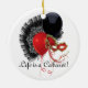 Encaminhamento cerâmico redondo com imagem, em ambos os lados, de um ventilador preto de penas, balões vermelho e preto e uma máscara vermelha. Texto opcional. Veja toda a coleção do Ornamento de Cancan nos TOUCHES ESPECIAIS | Seção Favoritos para festas.