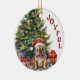 Na frente deste ornamento de Férias está a imagem de um adorável Bulldog Francês vestindo um chapéu de Papai Noel vermelho e branco. O cachorro se senta em frente a uma árvore decorada de Férias, e é envolto em uma corda de luzes festivas. O texto vermelho do lado diz "JOVEM". No verso, o texto vermelho e verde diz MERRY CHRISTMAS", e há campos de texto adicionais para você personalizar. Faça-o dizer o que quiser!