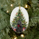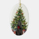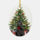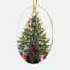 Na frente deste ornamento de Férias está a imagem de um Cachorro Negro Cocker Spaniel vestindo um arco vermelho festivo. O cachorro se senta em frente a uma árvore de Natal decorada. No verso, o texto vermelho e verde diz MERRY CHRISTMAS", e há campos de texto adicionais para você personalizar. Faça-o dizer o que quiser!