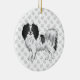 Faça seu Phalène fazer parte de suas decorações de Férias com a ajuda deste Enfeites de natal que apresenta a ilustração original de Destei de um cão de raça Phalène, preto e branco, de cor casaco. O fundo tem um padrão de pegadas de cinza. O outro lado tem duas áreas de texto personalizáveis. A cor da cinza do padrão de impressão da pata do cão pode ser alterada para qualquer outra cor, se assim o desejar.
