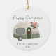 Camper Retro Green Christmas - O ornamento apresenta um adorável camper retrorreflector, todos aprisionados nos feriados com luzes de cordas, flores de inverno, bagas e luzes de cordas. Happy Campers está na tipografia bonito e moderna da escrita e é personalizada com seu nome de família e ano. A parte de trás do ornamento é um padrão floral de Natal coordenado. Também estará disponível com fotos no verso. O ornamento faz parte de uma coleção.