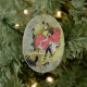Ornamento cerâmico oval com imagem, em ambos os lados, de uma dançarina de câncer girando casacos brancos sob uma saia rosa. Ela está vestindo meias pretas e uma prostituta preta em volta do pescoço. Há homens vestidos de smoking na foto. Um é condutor e o outro está olhando do palco traseiro. Veja toda a coleção do Ornamento de Cancan nos TOUCHES ESPECIAIS | Seção Favoritos para festas.