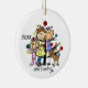 Um ornamento cerâmico bonito, do divertimento do Natal do feriado que caracterizam uma figura mães expectantes casal da vara, uma menina da criança, um cão marrom, uma árvore do feriado, e um texto que nos leia "estão esperando!" com uma área você pode adicionar o ano em curso!