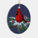 Este ornamento caracteriza minha ilustração do lápis da cor de um cardeal vermelho brilhante empoleirado em um ramo nevado do pinho, acompanhado das bagas vermelhas e dos flocos de neve que caem delicadamente para baixo contra um fundo malva escuro.