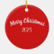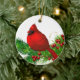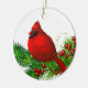 Christmas Ornament is shown in a round shape and is made of ceramic with a holiday print design of a red cardinal bird.