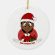 Enfeites de natal com a ilustração de uma linda e sorridente menina negra feliz com cabelo curto, ela está vestindo fantasia de Papai Noel vermelho e branco e segurando um presente; com modelo de texto editável para seu nome ou mensagem, design de feriados de Natal