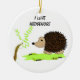 Um legal ouriço de desenho animado sobre um pedaço de grama verificando um galho de folhas. O ditado pode ser mudado como desejado.