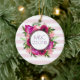 Um ornamento personalizado com as iniciais da ponte e do noivo e a data de casamento com um buquê floral composto por rosas de rosa claro e papoilas cor-de-rosa-escuro com muitas folhas verdes e exuberantes. Um quadro em camadas acima para colocar seu dentro de texto personalizado. O fundo é um padrão de listras rosa-macio.