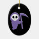 Ornamento adorável com Ceifador bonito! Um lado tem a ceifeira vestido com robe roxa contra o fundo preto e o reverso tem a ceifeira vestido com robe preta em um roxo contra um céu roxo. Uma adição adorável a sua árvore de Hallowe'en ou à outra decoração da doçura ou travessura.
