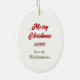 Na frente deste ornamento de Férias está a imagem de um adorável cão marrom Chihuahua deitado na sua cama de vime em frente a uma árvore de Natal decorada. O texto vermelho curvo no lado diz "NATAL". No verso, o texto vermelho e verde diz MERRY CHRISTMAS", e há campos de texto adicionais para você personalizar o que quiser.