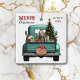 Um caminhão de coleta de retro azul lacrimogêneo carregar uma árvore de Natal decorada e pacotes de presentes neste Enfeites de natal de vidro bonito. Olhando para fora do porta-malas está um cão Labrador Retriever marrom de chocolate vestindo um chapéu de Papai Noel vermelho e branco. Um cartaz de madeira rústico na pára-choque diz "Feliz Natal". O texto vermelho e verde estilizado no topo à esquerda diz "MERRY CHRISTMAS", com seu nome (ou do seu cachorro) e o ano à direita. Ambos os lados têm a mesma imagem.