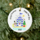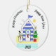 Condecoração de Árvore de Natal do Beach Hut, com uma cabana de praia azul e branca, que pode ser personalizada, erguida na areia, com um boneco de neve e uma árvore de natal de ambos os lados, enquanto as ondas ou o mar abrem a costa. "Feliz Natal", "Feliz ano novo", inicial e ano.