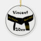 Personalize o Único Ornamento Redondo de Cintura Negra de Terceiro Grau de Artes Marciais com o nome do seu artista marcial e do ano atual. Crie um presente personalizado de manutenção da cinta preta para comemorar um 3º teste ou exame de promoção da cinta preta de Dan. Este Enfeites de natal de artes marciais personalizado apresenta uma fotografia digitalmente melhorada de um cinto-negro de artes marciais com três bares ou faixas de ouro na frente com as palavras Black Belt Club nas costas. Adequado para todas as artes marciais incluindo karatê, taekwondo, kung fu e judo.