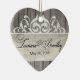 Este ornamento bonito, coração-dado forma caracteriza uma folha de prova filigrana translúcida e uma peça central do pergaminho envelhecido contra um fundo cinzento rústico do woodgrain. A ornamentação perfeita para sua primeira árvore de Natal ou como um presente do favor aos convidados wedding ou de partido. Use "personalizam-no" botão para personalizar este ornamento com seus próprios texto & fotografia. Disponível em 4 cores. Diversos produtos de harmonização disponíveis: os convites do casamento, salvar a data convidam, menu do comensal, cartões da resposta de RSVP, etiquetas, obrigado cartões e mais! Para perguntas ou pedidos feitos sob encomenda, envie-me por correio electrónico: cheryl@cheryldanielsart.com /contact. Eu estarei feliz criar ou alterar o que quer que você precisa de aumentar seu evento especial! Design original "filigrana" de madeira rústico pelo © 2014 de Cheryl Daniels.