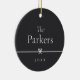 Um Enfeites de natal simples e doce apresenta um layout minimalista, com seu nome de família e o ano em uma fonte de serifa clássica e limpa em um fundo preto suave. Um pequeno arco através do centro completa a design. Adicione uma foto ao verso.
