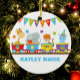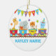 Este adorável ornamento animal de circo mostra animais de zoo em um safari. O trem contém uma girafa, elefante, tigre, e um hipopótamo bonitinho acima do monograma de seus filhos, escrito sob cores legal laranja, verde, vermelha e azul.