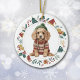Este adorável ornamento de Feriado apresenta uma imagem de aquarela de um adorável cachorrinho de Cocker Spaniel vestido em seu suéter e chapéu de inverno. A imagem é enquadrada dentro de uma coroa circular colorida composta por várias imagens de Férias, incluindo um boneco de neve, sinos, cana doce, estocagem, Holly e muito mais! A parte de trás do ornamento tem a mesma imagem de coroa com seu texto personalizado em verde, ouro e vermelho.