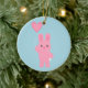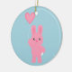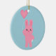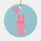 Um coelho doce, cor-de-rosa, estilo kawaii, com um rosto gordinho, braços e pernas, segura um balão em forma de coração cor-de-rosa sobre um fundo de bolinhas azul claro.