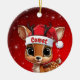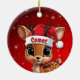 Comet! Celebrate the holiday season with this festive round ceramic red ornament featuring an endearing woodland forest animal cartoon graphic of a cute baby reindeer wearing a Santa hat. Perfect deer with antlers for decorating your tree or as a thoughtful gift, this whimsical doe decor makes a cherished keepsake for years to come. Customize by changing the text, the font, the font color, or remove the text. You can even transfer this design onto other products. Enjoy this design your way! Check out ForestBabies Xmas Deer Collection for matching decorations. 🎄🦌