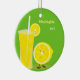 Um ornamento de dois lados com um fundo verde e um limão sorridente que está ao lado de um copo alto de limonada. O ornamento tem um nome personalizável e um ano que você pode criar.