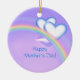 Bonito ornamento pendurado com meu trabalho de arte de dois corações brancos e azuis sobre um arco-íris num céu roxo. O texto personalizável diz "Dia de as mães feliz".