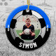 Celebre os triunfos atléticos do seu filho na liga jovem, faculdade ou futebol segundo grau com este Ornamento de Cores da Equipe Negra Azul de Futebol. Personalize com a foto, o nome e o ano do seu filho. Uma ideia de presente de excelente para vovó e vovô.