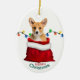 Na frente deste ornamento de Férias está uma imagem de um adorável cachorrinho de Corgi vermelho e branco em uma bolsa de presente de Natal. Atrás do cachorro há uma série de luzes coloridas de Feriado. O texto no final diz "Feliz Natal". A parte traseira do ornamento tem a mesma imagem com um campo de nome personalizado.