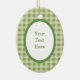Este adorno Holiday tem uma maravilhosa imagem vintage de um filhote marrom shaggy com uma cauda flutuante e vestindo um chapéu de Papai Noel vermelho e branco. A imagem é colocada sobre um fundo verde de gingham de férias. O outro lado usa o mesmo padrão de gingham que um quadro para seu texto personalizado em um fundo branco. Personalize-o para o presente de ornamento de uma criança, ou faça-o dizer o que quiser.