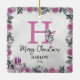 Enfeites de natal rosa para crianças bonitas, com um fundo de cinza lavado, flores e folhagem elegantes de Natal, adoráveis pinguins para bebês, boneco de neve, presentes, iniciais para crianças, nome, ano e a saudação festiva de 'natal alegre'.