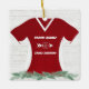 Camisas vermelhas e brancas correndo em jersey com nome, número, foto e ano editáveis. Pine Bough no fundo para um visual festivo de férias. O design de Jersey do outro país continua para trás do ornamento.